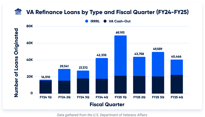 The chart below shows how Veterans have chosen between VA Streamline (IRRRL) and VA Cash-Out refinances over the 2024 and 2025 fiscal years.